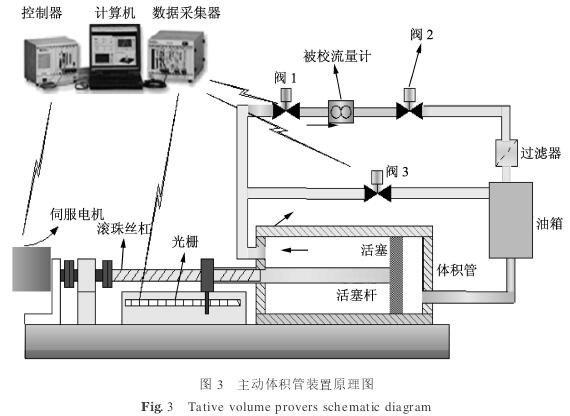 工作原理:校準(zhǔn)前開啟閥1, 2,關(guān)閉閥3,由伺服電機(jī)通過滾珠絲杠帶動(dòng)活塞在主動(dòng)體積管中運(yùn)動(dòng),產(chǎn)生標(biāo)準(zhǔn)流量源(標(biāo)準(zhǔn)流量的大小由上位機(jī)軟件通過調(diào)節(jié)電機(jī)轉(zhuǎn)速進(jìn)行控制),液體通過閥1流經(jīng)被校流量計(jì),*終流入油箱.光柵用于測(cè)量活塞行程,活塞行程與活塞截面積的乘積再除以運(yùn)行時(shí)間就得到體積流量,通過比較被校流量計(jì)的示值與體積管測(cè)量的標(biāo)準(zhǔn)體積流量值實(shí)現(xiàn)流量計(jì)的校驗(yàn).