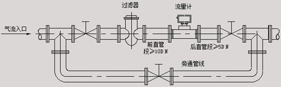 渦輪流量計(jì)的安裝有法蘭連接、螺紋連接及夾裝式三種方式。安裝時(shí)液體流動(dòng)方向應(yīng)與傳感器外殼上指示流向的箭頭方向一致,且上游直管段應(yīng)大于等于20倍管徑,下游直管段大于等于5倍管徑。