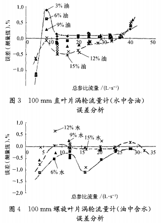 兩種渦輪葉片流量計(jì)測量液液雙相流時(shí),*二組分體積分?jǐn)?shù)變化的效應(yīng)對(0.2%~0.5%)R準(zhǔn)確度TUF是不容忽視的。