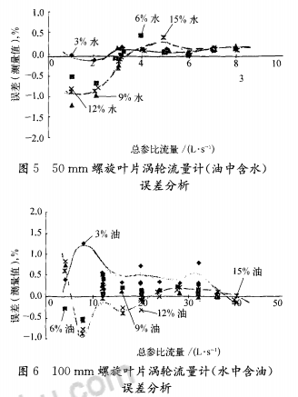 3)油中含水與水中含油兩者誤差變化的差異。渦輪流量計(jì)測量水中含油*二組分體積分?jǐn)?shù)變化引起測量誤差變化比油中含水大。