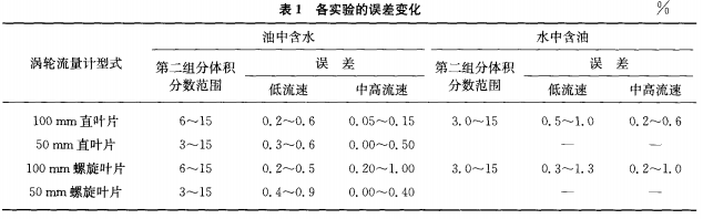油水混合液在水平管道內(nèi)靜止時(shí)油和水是分層的;在開始流動或很低流速時(shí)處于油水兩層的分層流;隨著流速增加油水逐漸混合,流速愈大兩相混合愈均勻;當(dāng)進(jìn)入渦輪葉片轉(zhuǎn)動時(shí)兩相混合將更為均勻。因此,混合液兩相均勻程度是影響測量誤差的因素之一。