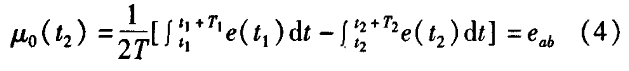 熱力管網(wǎng)供水流量計一般都采用工頻交流電源供電,其電源電壓的幅值和頻率的變化都會給熱力管網(wǎng)供水流量計帶來電源性干擾噪聲。對電源電壓的幅值變化,因采用多級集成穩(wěn)壓,一般而言電源電壓的幅值變化對電磁流量的測量精度影響不大。當(dāng)電源電壓的頻率波動時,雖然其波動范圍有限,但對熱力管網(wǎng)供水流量計測量精度影響較大。為了解決工頻干擾問題,實現(xiàn)對流體流速感應(yīng)電勢e柚信號的準(zhǔn)確測量,需利用以下基本關(guān)系:①勵磁周期為工頻周期的整數(shù)倍,即勵磁頻率為50/nHz(n為偶數(shù));②正負(fù)勵磁下的同相位采樣。圖2是對應(yīng)低頻矩形波勵磁形式下的典型電勢信號形式,按上述關(guān)系在一個勵磁周期下,若假設(shè)t。和t:點為工頻干擾的等效干擾點,且采樣寬度T=T1=T2,則e –ab的基本算式為:,