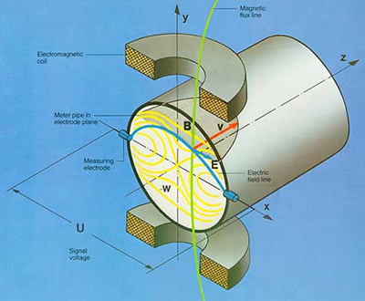 當(dāng)導(dǎo)電液體沿測量管在交變磁場與磁力線成垂直方向運(yùn)動時(shí),導(dǎo)電液體切割磁力線產(chǎn)生感應(yīng)電勢。在與測量管軸線和磁力線相互垂直的管壁上安裝了一對檢測電*,將這個(gè)感應(yīng)電勢檢出。