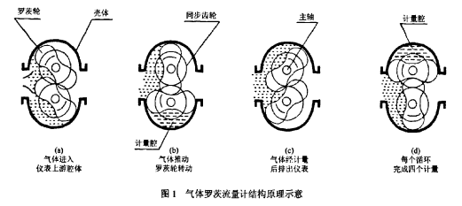 氣體羅茨流量計是一種容積式流量儀表。當(dāng)氣體通過流量計時,在入口和出口間產(chǎn)生的壓差,作用在與高精密同步齒輪聯(lián)結(jié)在一起的一對羅茨輪上,從而驅(qū)動羅茨輪旋轉(zhuǎn)。在這期間,羅茨輪與殼體內(nèi)壁和壓蓋之間形成的密閉空間——計量腔周期地充氣和排氣。羅茨輪的轉(zhuǎn)數(shù)與通過流量計的氣體體積量成正比。羅茨輪的旋轉(zhuǎn)經(jīng)磁耦合器傳遞給機械計數(shù)器(或輸出流量脈沖信號),從而累積流經(jīng)計量腔的體積量實現(xiàn)計量的目的。其原理如圖l。