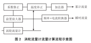 渦輪流量計通過不同的計算方法,可分別顯示累計流量和瞬時流量。當渦輪葉片切割殼體內(nèi)永久磁鋼產(chǎn)生的磁力線時,將引起傳感線圈磁通的變化,磁通周期變化信號經(jīng)前置放大器放大、整形,產(chǎn)生與流速成正比的脈沖信號,脈沖信號經(jīng)流量積算電路換算后顯示累積流量值,同時經(jīng)頻率電流轉(zhuǎn)換電路轉(zhuǎn)換成模擬電流量,進而顯示瞬時流量值(圖 2)。