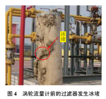 通過逐項排查,發(fā)現(xiàn)流量計前面的過濾器和流量計后的調(diào)壓裝置存在一定程度的冰堵(圖4)。采取管道排污、輔助加熱、清洗過濾器及調(diào)低流量計入口壓力至4.0MPa等措施,改善了天然氣的節(jié)流效應,使渦輪流量計能夠正常運行。經(jīng)與下游門站渦輪流量計比對,輸差控制在有效范圍。