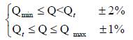 由圖2 可見,儀表系數(shù)可分為二段,即線性段和非線性段。在非線性段, 實(shí)際特性受軸承摩擦力、流體粘性阻力影響較大。當(dāng)流量低于Qmin 時(shí),儀表系數(shù)隨著流量迅速變化。壓力損失與流量的平方成正比關(guān)系。通常線性段約為工作段的2/3,其特性與渦輪結(jié)構(gòu)參數(shù)及流體粘性有關(guān)。隨流量的變化其儀表系數(shù)K 也會(huì)有一定的變化,但變化不大,通常將其變化幅度稱為流量計(jì)的計(jì)量準(zhǔn)確度。對(duì)于產(chǎn)品設(shè)計(jì)而言,期望能將線性段的流量范圍拓展,一臺(tái)流量計(jì)能覆蓋同口徑的不同流量范圍,使得產(chǎn)品量程比變寬從而降低生產(chǎn)管理與生產(chǎn)批量加工成本。對(duì)于1.0 級(jí)的高壓柴油流量計(jì)量表,以Qt(0.2Qmax)為分界流量點(diǎn),將計(jì)量線性分為兩段,其中一段的*大允許誤差為±2%,而另一段的*大允許誤差為±1% 。按圖2 所示,通常每臺(tái)渦輪流量計(jì)均有較為相似特性曲線,若將可測(cè)量流量范圍做寬,就能在同口徑不同流量范圍進(jìn)行分段截取,以實(shí)現(xiàn)一臺(tái)流量計(jì)能覆蓋同口徑的不同流量范圍。