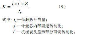 根據(jù)實(shí)際流量計(jì)的所測(cè)得儀表系數(shù)K 更換對(duì)應(yīng)齒輪傳動(dòng)比,使機(jī)械表頭顯示部分和齒輪轉(zhuǎn)動(dòng)發(fā)出低頻脈沖輸出均與高頻脈沖輸出匹配,實(shí)際三者關(guān)系如下: