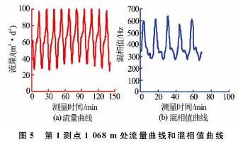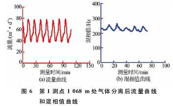 B2-××-××2井是大慶油田采油一廠1口水驅(qū)產(chǎn)出井,該井井口計量產(chǎn)液51.72m3/d,取樣化驗含水率81.8%。采用阻抗式含水率計在該井進行了測試,圖5為*1測點深度1068m測量的流量及混相值曲線圖。圖5的流量曲線表明,流量曲線受氣體影響較大,測量流量波動較大,在25~98m3/d之間波動,平均值為58.6m3/d;混相值波動也很大,在280~640Hz之間劇烈波動,平均值圖5*1測點1068m處流量曲線和混相值曲線388Hz。該井測量流量為65.8m3/d,測量含水為51.3%,受井下產(chǎn)氣影響明顯,測量流量明顯高于井口計量流量,測量含水率明顯低于化驗含水率。同時,在該井測井時,使用了儀器上裝有氣體分離器的阻抗式含水率計在該井進行測試,*1測點的流量及混相值曲線見圖6。由于氣體分離器將氣體分離,未進入測量通道,減小了氣體對測量傳感器的影響,測量的流量及混相值曲線波動明顯減少,流量波動為36~78m3/d,平均值為55m3/d;混相值波動為211~288Hz,平均值為228Hz。測量流量為54.8m3/d,測量含水率為80.4%,與井口計量非常接近。對比測量結(jié)果表明,氣體對流量及含水率測量造成了非常大的測量誤差,已不能進行準確測量。