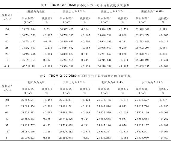 不同壓力下每個流量計的儀表系數(shù)如表1和表2所示。