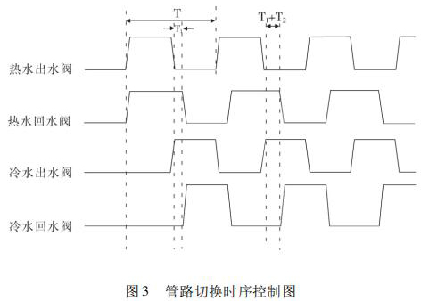 開始試驗,冷熱水箱預(yù)先達(dá)到試驗要求溫度,水泵運轉(zhuǎn)調(diào)節(jié)管路流量至設(shè)定值。系統(tǒng)給定信號控制四個開關(guān)閥(熱水出水閥、熱水回水閥、冷水出水閥、冷水回水閥) 的打開與關(guān)閉,實現(xiàn)冷熱水的切換。熱水沖擊時,熱水出水閥與熱水回水閥打開的同時,冷水出水閥與冷水回水閥關(guān)閉,確保試驗管路熱水沖擊;同理,冷水沖擊時,冷水出水閥與冷水回水閥打開,熱水出水閥與熱水回水閥關(guān)閉,確保試驗管路冷水沖擊。系統(tǒng)通過四個開關(guān)閥對管路進(jìn)行時序控制,達(dá)到管路切換的目的,很好地實現(xiàn)了 4000次冷熱循環(huán)沖擊試驗。其具體的管路切換控制時序圖如圖 3 所示。