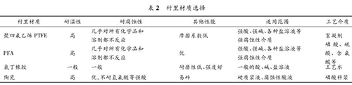 焦油流量計(jì)要根據(jù)被測流體的溫度、壓力、速度以及含固顆粒的硬度、含量和粒徑大小來決定測量管內(nèi)襯的材質(zhì)。該濕法磷酸裝置中,焦油流量計(jì)測量管襯里材質(zhì)的種類見表 2。