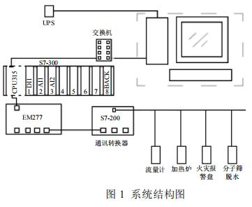 集氣站是收集氣井所生產(chǎn)天然氣的站場,在集氣站內(nèi)對(duì)天然氣進(jìn)行節(jié)流降壓、加熱、調(diào)壓計(jì)量等各種工藝預(yù)處理,設(shè)備眾多且分散。為方便進(jìn)行檢測和操作,必須進(jìn)行統(tǒng)一的數(shù)據(jù)采集,在監(jiān)控臺(tái)進(jìn)行數(shù)據(jù)的管理。集氣站設(shè)備主要包括加熱爐、防凍液流量計(jì)、分子篩、火災(zāi)報(bào)警盤,以及供電設(shè)備 UPS 等,這些不同廠家的設(shè)備基本都支持Modbus 協(xié)議,通過 Modbus 通訊可以將這些數(shù)據(jù)采集。為了有效降低成本,設(shè)計(jì)了如圖 1 所示的系統(tǒng)。系統(tǒng)采用西門子 S7-300 控制器,通過以太網(wǎng)連接上位機(jī)監(jiān)控軟件,再通過 MP277 連接S7-200 的方式。S7-200 控制器自帶 RS485 接口,能夠進(jìn)行 Modbus 通訊,采集現(xiàn)場各種設(shè)備數(shù)據(jù)。*后通過以太網(wǎng)通訊將設(shè)備數(shù)據(jù)上傳至監(jiān)控軟件,方便操作人員進(jìn)行監(jiān)控,該方案簡單有效,能夠?qū)崿F(xiàn)集氣站內(nèi)設(shè)備的狀態(tài)監(jiān)控,數(shù)據(jù)處理,有效的進(jìn)行天然氣的生產(chǎn)工作。