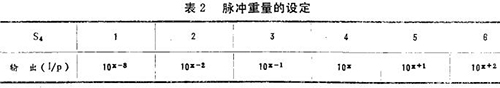 脈沖重量設(shè)定用S4插頭選擇進(jìn)行,它的設(shè)定有一定的條件,這些條件是脈沖輸出的類型、脈沖寬度和刻定常數(shù)。并且它的選擇范圍還要依據(jù)脈沖寬度和*大測(cè)量流量-口-口口-l0的X方(m3/h)來(lái)確定。其系數(shù)-(數(shù)字同*大流量m3/h)由*大流量的前三位有效數(shù)定決定,而對(duì)應(yīng)于“x”值的脈沖重量(l/p)見表2。
