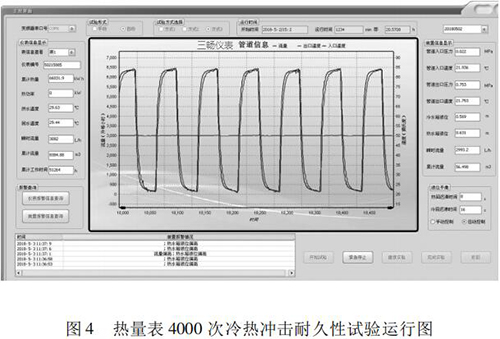本文研究的 4000 次冷熱沖擊試驗(yàn)的實(shí)現(xiàn)具有以下特點(diǎn): (1)基于“工控機(jī) +水泵 + 雙氧水流量計(jì)”的閉環(huán)控制系統(tǒng),實(shí)現(xiàn)了流量自動反饋調(diào)節(jié),滿足試驗(yàn)要求; (2)通過四個開關(guān)閥的時序切換,自動控制試驗(yàn)溫度,很好的完成了 4000 次溫度沖擊試驗(yàn); (3)通過“工控機(jī) + 數(shù)據(jù)數(shù)據(jù)采集卡”的數(shù)據(jù)采集系統(tǒng),實(shí)時監(jiān)控試驗(yàn)過程中的流量、溫度、壓力等相關(guān)參數(shù),實(shí)現(xiàn)試驗(yàn)方式的自動控制,并能對試驗(yàn)數(shù)據(jù)進(jìn)行分析與評定。 (4)試驗(yàn)的全過程為智能自動化,可無人員留守看護(hù)。試驗(yàn)結(jié)果可直接反映出熱量表在長時間運(yùn)行后的可靠性。為我國熱量表耐久性試驗(yàn)研究提供檢測手段,為促進(jìn)產(chǎn)品質(zhì)量提升做好技術(shù)保障。