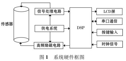 高頻勵(lì)磁自來水流量計(jì)由傳感器、高頻勵(lì)磁電路、信號(hào)處理電路等組成,其中高頻勵(lì)磁電路決定著傳感器磁場的強(qiáng)弱,勵(lì)磁電路的穩(wěn)定性以及精確性決定著系統(tǒng)檢測(cè)的準(zhǔn)確性以及穩(wěn)定性。DSP 系統(tǒng)控制勵(lì)磁電路激勵(lì)傳感器線圈,當(dāng)線圈中有導(dǎo)電液體流過時(shí),其切割磁感線并在傳感器兩端的線圈上產(chǎn)生感應(yīng)電動(dòng)勢(shì),利用信號(hào)檢測(cè)電路監(jiān)測(cè)感應(yīng)電動(dòng)勢(shì)的大小,*后根據(jù)相應(yīng)關(guān)系計(jì)算出液體的流量,系統(tǒng)硬件框圖如圖 1 所示。