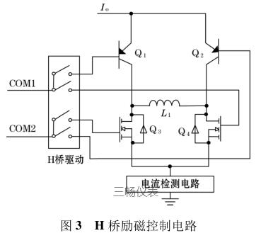 由圖 3 可知,I o 為高低壓切換恒流控制電路輸出的恒流源電流,H 橋驅(qū)動(dòng)的 COM1 端控制三*管 Q 1和場效應(yīng)管 Q 4 的通斷;COM2 端控制三*管 Q 2 和場效應(yīng)管 Q 3 的通斷。L 1 表示的是勵(lì)磁線圈(傳感器中線圈),COM1、COM2 為正交的 PWM 波信號(hào),因此在勵(lì)磁線圈 L 1 的兩端會(huì)產(chǎn)生方波勵(lì)磁信號(hào)。檢流電路主要是用來檢測(cè)勵(lì)磁線圈中電流的變化,當(dāng)線圈中的勵(lì)磁電流方向變化時(shí),可以及時(shí)將此信息反饋給高低壓切換恒流控制電路中的比較器,從而實(shí)現(xiàn)切換高低壓源達(dá)到恒流控制的目的。