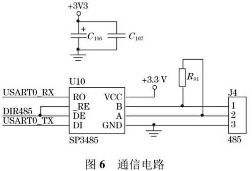 自來水流量計(jì)輸出的流量值可以通過外接的 TFTLCD 屏直接顯示,還可以通過預(yù)留的 RS485 通信接口將數(shù)據(jù)發(fā)送到上位機(jī)中。RS485 電路*大的優(yōu)點(diǎn)是 485 電平與 TTL 電平兼容,方便與 TTL 電路相連;抗共模干擾能力強(qiáng);數(shù)據(jù)傳輸速度快,高達(dá) 10 Mbps;通信距離遠(yuǎn),*大為 1.2 km。系統(tǒng)采用 SP3485 芯片進(jìn)行數(shù)據(jù)通信,SP3485 是一款低功耗芯片且符合RS485 協(xié)議的收發(fā)器,電路圖如圖 6 所示。