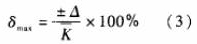 圖2顯示測量出電脈沖信號頻率F用平均儀表系數(shù)`K計算得到的Q值,在Qmin~Qmax范圍內的*大相對誤差為: