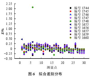 選取與以上要求的9個(gè)關(guān)鍵雷諾數(shù)相近的流量點(diǎn)數(shù)據(jù)進(jìn)行擬合,并與全數(shù)據(jù)擬合結(jié)果進(jìn)行比較,兩者差別通過式(9)進(jìn)行評(píng)估。圖6是兩種擬合方式差別分布情況。300對(duì)數(shù)據(jù)點(diǎn)中,僅有1點(diǎn)儀表系數(shù)差別超過2%,其他各點(diǎn)差別均小于0.5%,而且99%以上的數(shù)據(jù)點(diǎn)差別小于±0.33%,86%以上的數(shù)據(jù)點(diǎn)差別小于±0.20%。