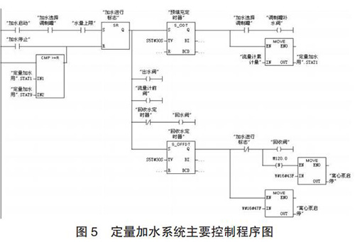 (2)程序設計。儲水罐水量控制的工作過程為:當壓力變送器檢測到儲水罐的水量低于 450kg 時,補水閥 3 開啟為儲水罐補水;當水量達到 490kg 時,補水閥 3 關閉;生產配制過程中,循環(huán)以上控制過程。儲水罐水量控制的程序如圖 4 所示。