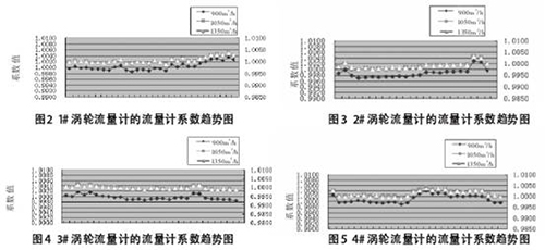 設(shè)有1套在線分析系統(tǒng),對(duì)原油密度、黏度和含水等**進(jìn)行檢測(cè)。柴油流量表的檢定采用體積管在線檢定,采用體積管對(duì)這4臺(tái)流量計(jì)檢定的流量計(jì)系數(shù)(流量計(jì)系數(shù)是流量計(jì)基本誤差的一種表示方法,貿(mào)易交接量=流量計(jì)讀數(shù)×流量計(jì)系數(shù))趨勢(shì)圖如圖2~圖5所示。