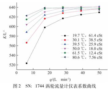 本文以航空潤滑油流量標(biāo)準(zhǔn)裝置為試驗平臺,對4支熱水計量表在不同溫度點進行校準(zhǔn)試驗,對儀表系數(shù)隨粘度和流量變化關(guān)系進行分析,并通過雙指數(shù)衰減函數(shù)對儀表系數(shù)(K)和頻率與粘度之商(F/υ)進行曲線擬合。