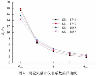 4支流量計各流量點q下儀表系數(shù)誤差ET曲線如圖4所示。
