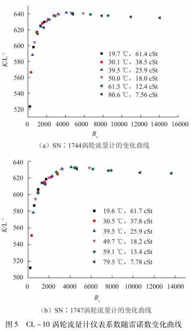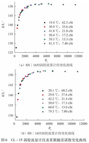 熱水計量表不同溫度點儀表系數(shù)差異很大,主要原因是溫度改變導(dǎo)致航空潤滑油粘度改變。校準(zhǔn)結(jié)果中儀表系數(shù)隨流量變化曲線未體現(xiàn)滑油粘度對熱水計量表的影響,流量計儀表系數(shù)K隨雷諾數(shù)的變化曲線如圖5和圖6所示。同一支流量計在雷諾數(shù)相近的情況下,其對應(yīng)的儀表系數(shù)很接近,儀表系數(shù)是雷諾數(shù)的單值函數(shù)。雷諾數(shù)Re關(guān)系式為