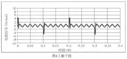 工頻干擾是酒精流量計(jì)常見的干擾源。當(dāng)流量計(jì)處于電源形成電磁場(chǎng)中時(shí),由于分布電容的存在,以電磁波的輻射形式干擾電*信號(hào),或者是由供電電源引入的工頻串?dāng)_,工作現(xiàn)場(chǎng)的工頻共模干擾,其產(chǎn)生的物理機(jī)理均是電磁感應(yīng)原理。幅度與流量信號(hào)相比,往往要大幾個(gè)數(shù)量級(jí),頻率與供電電源頻率相同。如圖4所示,線圈驅(qū)動(dòng)頻率為5Hz的電*信號(hào),被耦合了50Hz的工頻干擾,幅度大概相當(dāng)于1feet/s。