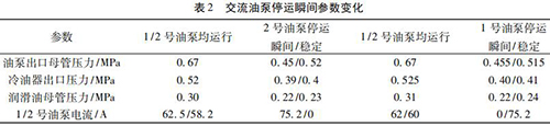 通過(guò)內(nèi)部旁通將冷油與熱油混合,經(jīng)過(guò)銅粉- 煤油 - 蠟感溫元件控制冷熱油混合比例,將油溫調(diào)節(jié)到 49 ℃。一臺(tái)防爆渦輪流量計(jì)穩(wěn)定運(yùn)行,油泵出口母管壓力 0. 5 MPa,潤(rùn)滑油母管壓力 0. 24 MPa,均屬于正常情況,而兩臺(tái)交流油泵并列運(yùn)行時(shí),停運(yùn)其中一臺(tái)交流油泵瞬間會(huì)觸發(fā)防爆渦輪流量計(jì)出口母管壓力開(kāi)關(guān)動(dòng)作,說(shuō)明停運(yùn)瞬間油壓發(fā)生波動(dòng),且油泵出口母管油壓波動(dòng)至小于 0. 45 MPa。正常運(yùn)行時(shí)防爆渦輪流量計(jì)出口油溫 71.5 ℃,冷油器出口溫度45 ℃,混合后潤(rùn)滑油母管溫度52.5 ℃,由能量守恒定律可知,經(jīng)過(guò)冷油器的油量/不經(jīng)冷油器的油量= ( 71.5-52.5) ÷ ( 52.5- 45) = 2. 53,說(shuō)明有 70% 左右的油量經(jīng)過(guò)冷油器。當(dāng) 2 臺(tái)防爆渦輪流量計(jì)運(yùn)行時(shí)油量大于單泵運(yùn)行,其中一臺(tái)防爆渦輪流量計(jì)瞬間停運(yùn)時(shí)油量減少,尤其是經(jīng)過(guò)冷油器的油量大量減少,油量在溫控閥二次分配過(guò)程中出現(xiàn)調(diào)節(jié)異常,導(dǎo)致油壓過(guò)大波動(dòng)。為檢驗(yàn)溫控閥工作情況,保持 1 號(hào)、2 號(hào)交流油泵運(yùn)行,選取機(jī)組正常帶負(fù)荷運(yùn)行時(shí)油溫 52 ℃,分別停運(yùn) 1、2 號(hào)交流油泵,觀察 1、2 號(hào)交流油泵停運(yùn)瞬間油泵出口母管壓力波動(dòng)情況,試驗(yàn)各參數(shù)變化見(jiàn)表 2。