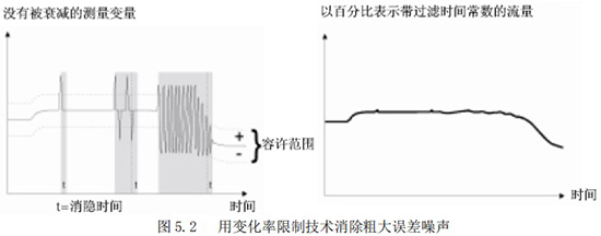 “變化率限制值”與“不敏感時(shí)間值”是用來消除某些增加阻尼不能除去的噪聲。它能夠從真實(shí)的流量信號(hào)中判別出階躍信號(hào)引起的噪聲和漿液尖狀噪聲。這種判別是以變化率的限制和持續(xù)時(shí)間為依據(jù)的。圖 5.2 所示為使用變化率限制技術(shù)去除粗大誤差的原理說明。該功能為在前面采樣中獲得的流量數(shù)據(jù)經(jīng)一階濾波后的,設(shè)定某一上限和下限(變化率)。如果當(dāng)前采樣的流量數(shù)據(jù)超過或低于這個(gè)*限值,而且在超過或低于這個(gè)*限值的變化時(shí)間之內(nèi),則認(rèn)為這種變化是由于噪聲所引起的,CPU 予以切除;而當(dāng)超過或低于這個(gè)*限值的變化在設(shè)置的不敏感時(shí)間以外,則認(rèn)為這種變化是由于真正的流量變化所引起,CPU 就認(rèn)可是測(cè)量流量的變化。