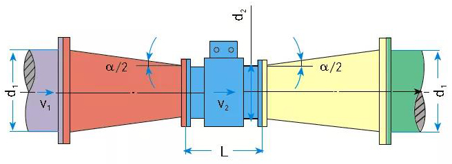 所以在有些流速偏低工況下,為了使污泥流量計(jì)工作在合適的流速范圍,允許有一定的壓力損失時(shí),可以選擇流量計(jì)傳感器的口徑小于管道口徑,在儀表前后增加異徑管,提高介質(zhì)流速。異徑管的中心錐角α不大于15°,可以視為直管,如圖5。