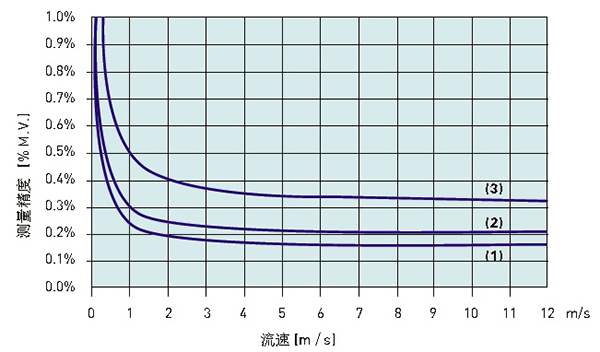 污泥流量計(jì)實(shí)質(zhì)是測(cè)量介質(zhì)的流速,它是速度式流量計(jì)。一般電磁流量計(jì)推薦流速在0.3m/s-5m/s,在這個(gè)范圍內(nèi),流量計(jì)測(cè)量精度高、線性好、水力損耗小、介質(zhì)對(duì)流量計(jì)傳感器襯里和電*的磨損也較小。以某品*電磁流量計(jì)選型樣本提供的流速曲線為例(見(jiàn)圖3),可以看出流量越小、流速越慢,測(cè)量誤差越大,曲線在0.3m/s處存在拐點(diǎn)。