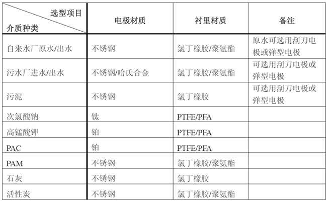 電*對(duì)被測(cè)量介質(zhì)的耐腐、抗磨蝕、無(wú)電化學(xué)反應(yīng)是選擇材質(zhì)考慮的因素。常用金屬材料有含鉬耐酸鋼、哈氏合金B(yǎng)、哈氏合金C、鈦、鉭、鉑銥合金等。由于介質(zhì)種類繁多,其腐蝕性又受溫度、濃度、流速等復(fù)雜因素影響而變化,生產(chǎn)廠僅能給出很粗略的各種電*的適用范圍。電*材質(zhì)的選擇可從使用者借鑒該介質(zhì)在其他設(shè)備的應(yīng)用實(shí)例和以往的經(jīng)驗(yàn)來(lái)確定。浙江某自來(lái)水廠用于計(jì)量5-10%次氯酸鈉投加,電*材質(zhì)選擇了哈氏合金,在運(yùn)行使用1年多的時(shí)間后,出現(xiàn)傳感器故障,返廠檢測(cè)發(fā)現(xiàn)電*腐蝕,后我司選擇鈦電*材質(zhì),現(xiàn)運(yùn)行情況良好。水行業(yè)常規(guī)選型詳見(jiàn)表2。