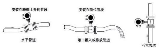 流量計(jì)可以水平、垂直和傾斜安裝。但是管路結(jié)構(gòu)應(yīng)保證測量管必須始終充滿液體(滿管)。管路設(shè)計(jì)時(shí)注意確保測量管段無氣泡,否則將會(huì)造成測量不穩(wěn)定和偏差過大。