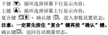 儀表有兩個運(yùn)行狀態(tài):自動測量狀態(tài)、參數(shù)設(shè)置狀態(tài)。儀表上電時,自動進(jìn)入測量狀態(tài)。在自動測量狀態(tài)下,儀表自動完成各測量功能并顯示相應(yīng)的測量數(shù)據(jù)。在參數(shù)設(shè)置狀態(tài)下,用戶使用四個面板鍵,完成儀表參數(shù)設(shè)置。