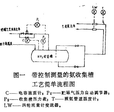 衛(wèi)生型液體渦輪流量計安裝在氨收集槽液氨管道上,帶控制測量的氨收集槽工藝簡單流程是:當320kg/cm2液氨送入收集槽,降壓到16kg/cm2,氨在收集槽內(nèi)進行氣液相分離,分離后的貯罐氣送出管路,分離后的液氨,經(jīng)液氨管道送到液氨倉庫(如‘圖一所示)