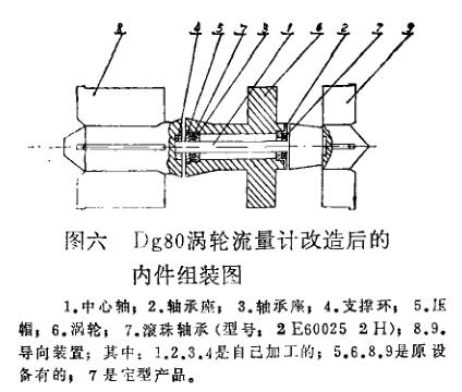 使甩中譯杯料在液氨中發(fā)生膨脹,會使渦輪轉(zhuǎn)速減小,甚至轉(zhuǎn)不動。以后改為石墨軸.早t。使用甲段時間,由于軸承受滑動摩擦,李乍期高速雄轉(zhuǎn)下很快磨損,間隙增大,渦羚軸串動,造成計量不準。?,F(xiàn)在釋們改用不銹鋼滾珠軸承,這樣將滑動摩擦改為滾動摩擦,起動轉(zhuǎn)矩小,轉(zhuǎn)動靈活。近兩年在每年一度大檢修中,拆下檢查沒有發(fā)現(xiàn)什么問題(改制零件的詳細情況見圖二、三、四、五、六)。
