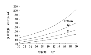 (2)可見,對(duì)確定的渦輪流量傳感器,易知口徑D大,K。值小;葉片數(shù)n大,K。值大等。如果要獲得較大的儀表常數(shù),就一要對(duì)渦輪傳感器的結(jié)構(gòu)參數(shù)進(jìn)行優(yōu)化設(shè)計(jì),從圖(2)可以看出,葉片高度h增加,K。增大;導(dǎo)程角增大,K。增大。對(duì)于φ19的過(guò)環(huán)空大排量渦輪流量計(jì)而言,由上式計(jì)算得K。=74.567rpm/m³/d,而水中標(biāo)定的Kw=78.89rpm/m³/d,表1給出不同口徑和不同導(dǎo)程角下渦輪流量計(jì)固有儀表常數(shù)的計(jì)算值。