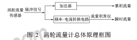 渦輪的旋轉(zhuǎn)角速度是通過(guò)裝在機(jī)殼外的傳感線圈來(lái)檢測(cè)。當(dāng)渦輪葉片切割由殼體內(nèi)永久磁鋼產(chǎn)生的磁力線時(shí),就會(huì)引起傳感線圈中的磁通變化。傳感線圈將檢測(cè)到的磁通周期變化信號(hào)送入前置放大器,對(duì)信號(hào)進(jìn)行放大、整形,產(chǎn)生與流速成正比的脈沖信號(hào),送入單位換算與流量積算電路得到并顯示累積流量值;同時(shí)亦將脈沖信號(hào)送入頻率電流轉(zhuǎn)換電路,將脈沖信號(hào)轉(zhuǎn)換成模擬電流量,進(jìn)而指示瞬時(shí)流量值。圖2為渦輪流量計(jì)總體原理框圖。