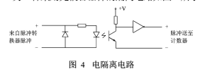 根據(jù)分析和實(shí)驗(yàn)證明,干擾信號(hào)的進(jìn)入,主要因?yàn)槊}沖轉(zhuǎn)換器的電源由檢定裝置的直流穩(wěn)壓電源提供,電壓脈沖信號(hào)直接傳送至脈沖計(jì)數(shù)器,電網(wǎng)中高次諧波的干擾會(huì)經(jīng)過(guò)直流穩(wěn)壓電源進(jìn)入脈沖轉(zhuǎn)換器,從而串入正常的脈沖當(dāng)中。另外,脈沖轉(zhuǎn)換器與脈沖計(jì)數(shù)器之間的連接線,也不可避免地感應(yīng)到干擾信號(hào)。一種消除此類干擾的措施是斷開(kāi)脈沖轉(zhuǎn)換器與檢定裝置之間的直接電的連接,采用電隔離的信號(hào)傳輸方式傳送脈沖信號(hào),能夠有效隔絕干擾脈沖的進(jìn)入。另一種采用光耦合器件的隔離電路如圖4所示: