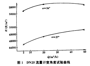 對DN25流量計分別做了葉片安裝角a為27°和34°的變角度試驗,其結(jié)果見表1和圖1。