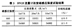 位于流量計之上,緊貼殼體處安裝著磁電轉(zhuǎn)換器,它將對渦輪葉片(由鐵磁性材料制成)產(chǎn)生一個恒定的磁性阻力矩。無論葉片處在靜止或轉(zhuǎn)動過程中都將始終受到這一磁力作用。這一磁力將直接影響著流量計的性能,尤其小流量時影響更大。為了研究該磁力對流量計性能的影響情況,我們選取適當(dāng)?shù)拇鸥袘?yīng)強(qiáng)度,對同一臺DN25流量計進(jìn)行了變磁感應(yīng)強(qiáng)度B的影響試驗,其試驗結(jié)果見表3和圖3。