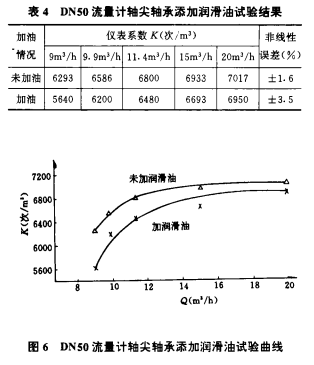 通常,流量計在出廠標(biāo)定前都在軸尖和軸承處加入少量的潤滑油,以防軸尖和軸承磨損過快。但是,由于潤滑油具有一定的粘性,它將影響流量計的性能,故我們對同一臺流量計做了不加潤滑油和加潤滑油的試驗,其試驗結(jié)果見表4和圖6.