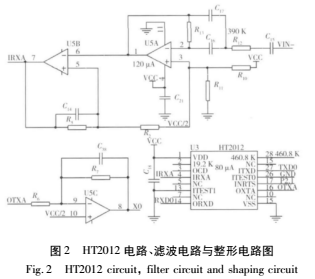 HART協(xié)議通信模塊主要由HART調(diào)制解調(diào)器HT2012和D/A轉(zhuǎn)換器AD421及其外圍電路實(shí)現(xiàn)。HART MODEM采用Smar公司的HT2012,是符合Bell202標(biāo)準(zhǔn)的半雙工調(diào)制解調(diào)器,實(shí)現(xiàn)HART協(xié)議規(guī)定的數(shù)字通信的編碼或譯碼。該芯片專為HART儀器設(shè)計(jì),片內(nèi)集成了符合Bell202標(biāo)準(zhǔn)的調(diào)制器、解調(diào)器、時(shí)鐘及定時(shí)電路、檢測(cè)控制電路,性價(jià)比較高。其中AD421通過(guò)串行接口接收現(xiàn)場(chǎng)儀表內(nèi)部MCU傳送的數(shù)字信號(hào),轉(zhuǎn)換成4~20mA電流輸出,輸出主要的測(cè)量結(jié)果。HT2012則從VIN-節(jié)點(diǎn)接收疊加在4~20mA環(huán)路上的信號(hào),對(duì)其帶通濾波和放大之后進(jìn)行載波檢測(cè),如果檢測(cè)到FSK頻移鍵控信號(hào),則將IRXA節(jié)點(diǎn)上的 1.2kHz的信號(hào)解調(diào)為‘1’,將IRXA節(jié)點(diǎn)上的2.2kHz信號(hào)解調(diào)為‘0 ’,并通過(guò)串口通信RXD0節(jié)點(diǎn)傳輸給C8051F020,C8051F020接收命令幀并作相應(yīng)的數(shù)據(jù)處理。之后,C8051F020產(chǎn)生要發(fā)回的應(yīng)答幀,應(yīng)答幀的數(shù)字信號(hào)由HT2012調(diào)制成相應(yīng)的1.2kHz和2.2kHz的頻移鍵控(FSK)信號(hào),即節(jié)點(diǎn)TXD0到節(jié)點(diǎn)OTXA的調(diào)制過(guò)程,并經(jīng)過(guò)發(fā)送信號(hào)整形電路進(jìn)行波形整形后,經(jīng)AD421疊加在環(huán)路上發(fā)送。C8051F020外接1.8432MHz晶振,4分頻后作為HART調(diào)制解調(diào)的時(shí)鐘信號(hào)源,電路圖如圖2所示。