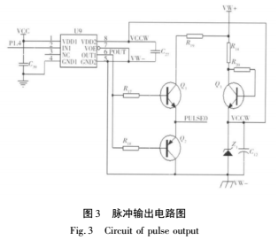 脈沖輸出模塊主要由高速光耦隔離器、穩(wěn)壓電路構(gòu)成。脈沖輸出是采用控制 P1.4口的高低電平翻轉(zhuǎn)來(lái)實(shí)現(xiàn)的??紤]到儀表安全性,流量計(jì)的脈沖輸出模塊均需要隔離保護(hù)。選用功耗低的高速CMOS信號(hào)隔離器,一端由AD421的輸出電壓VCC 3V供電,另一端由用戶供電。用戶通常提供DC 12V或DC 24V電源,所以采用穩(wěn)壓管Z1穩(wěn)壓5V給光耦另一端供電,如圖3所示,其中VW+,VW-為用戶提供的外接DC 12V或DC 24V電源輸入端,Q1,Q2為三*管。脈沖輸出時(shí),當(dāng)P1.4為高電平,POUT為高電平,Q1導(dǎo)通,Q2截止,節(jié)點(diǎn)PLUSEO輸出高電平;當(dāng)P1.4為低電平,POUT為低電平,Q1截止,Q2導(dǎo)通,節(jié)點(diǎn)PLUSEO輸出低電平。