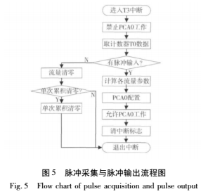 HART通信協(xié)議采用問(wèn)答式,即上位機(jī)(主機(jī))向下位機(jī)發(fā)出命令,下位機(jī)(從機(jī))回答。主機(jī)消息到來(lái)時(shí),通過(guò)觸發(fā)串口中斷來(lái)接收和發(fā)送數(shù)據(jù)。主循環(huán)程序還包括檢測(cè)溫度并送LCD顯示的子程序模塊,4~20mA電流輸出子程序模塊,累計(jì)流量寫鐵電子程序模塊等。系統(tǒng)主函數(shù)流程圖如圖4所示,脈沖采集、脈沖輸出流程圖如圖5所示。